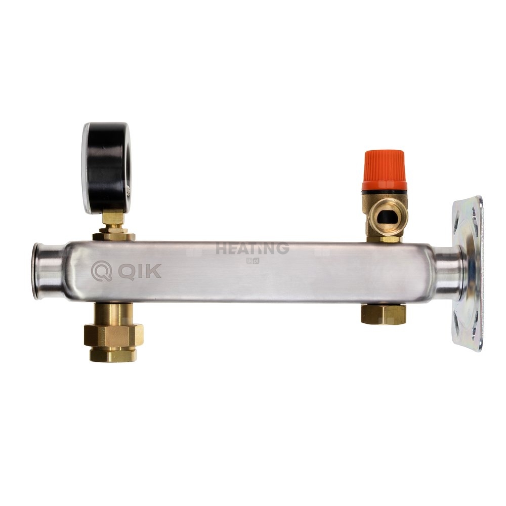 Grupy bezpieczeństwa QIK GBM do CWU mosiężna 6 bar z szybkozłączem do naczynia wzbiorczego, do zabezpieczenia instalacji wodu użytkowej przed nadmiernym wzrostem ciśnienia. Manometr ułatwia monitorowanie ciśnienia bez względu na miejsce montażu grupy bezpieczeństwa. Wydłużona belka grupy umożliwia współpracę nawet z dużymi naczyniami wzbiorczymi, solidna stalowa blacha montażowa z otworami typu fasolka. Przyłącza 3/4”