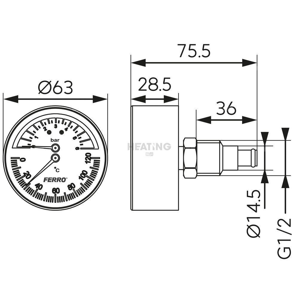 Termometr bimetaliczny FERRO fi 63 mm 120'C 6 bar połączenie aksjalny