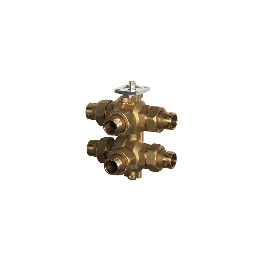 Zawór strefowy sześciodrogowy z półśrubunkiem do zastosowań w systemach czterorurowych, w których konieczna jest niezależna zamiana temperatury wody zasilającej do odbiorników, w celu uzyskania chłodzenia lub ogrzewania pomieszczeń.