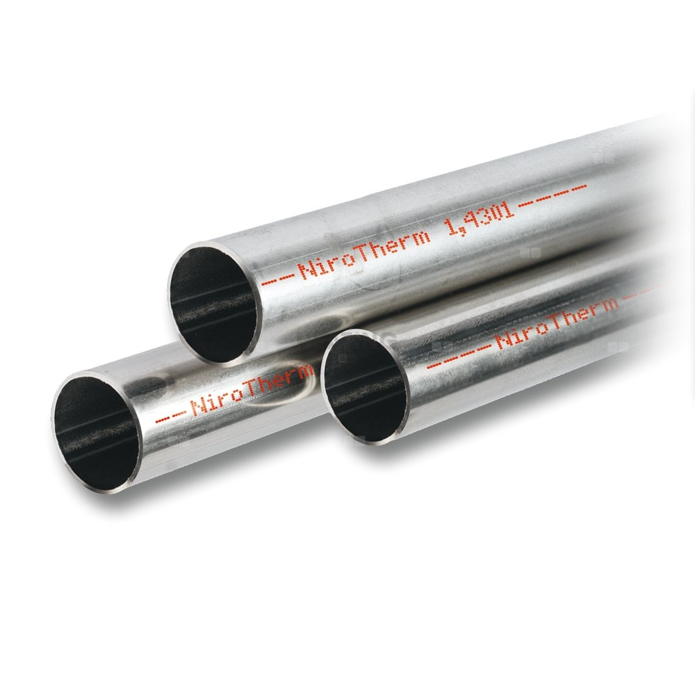 Rura systemowa NiroTherm, nr materiału 1.4301 (304), zmniejszona grubość ścianki, w prętach 6 m, do chłodzenia, sprężonego powietrza, ogrzewania i zastosowań przemysłowych, w połączeniu ze złączkami zaciskowymi SANHA-Therm serii 24000 lub złączkami NiroSan-Press serii 9008