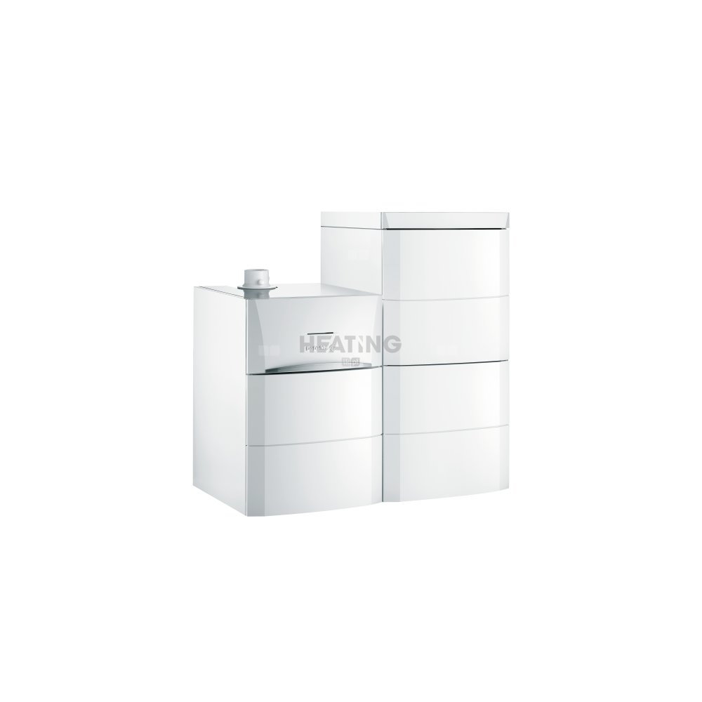 Kocioł w komplecie z warstwowym podgrzewaczem c.w.u. emaliowanym, wyposażonym w wymiennik płytowy podłączony do pompy ładującej oraz w wężownicę do podłączenia instalacji solarnej. Podgrzewacz umieszczony obok kotła, z prawej lub z lewej strony, w jednej linii z kotłem. Ochrona antykorozyjna przy pomocy „Titan Active System” (anoda nie zużywająca się). Wyposażony w kompletny zestaw solarny: pompę, naczynie wzbiorcze 12 l (opcjonalnie 18 l), grupę bezpieczeństwa, odpowietrznik, zbiornik glikolu, regulator solarny, zawór antyoparzeniowy. Zawór zpustowy, końcówka dla pętli cyrkulacji. Przewody połączeniowe kocioł-zasobnik i czujnik c.w.u. w zakresie dostawy, regulowane nóżki